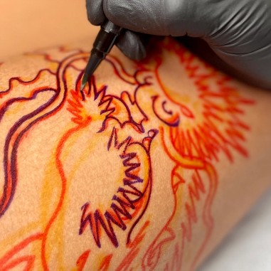 Der FLEX-TIP Stift ahmt die Flexibilität und Vielseitigkeit eines Künstlerpinsels nach. Seine spitz zulaufenden, flexiblen Borsten reagieren auf Druckvariationen und ermöglichen so unterschiedliche Linienbreiten und ausdrucksstarke Striche. Beliebt bei Tätowierern für Kalligrafie, Illustrationen und dynamische stilisierte Linien. Die Anpassungsfähigkeit der Pinselspitze ermöglicht sowohl feine Details als auch breitere Linien und gibt Künstlern ein vielseitiges Werkzeug für den kreativen Ausdruck an die Hand. (Einfacher Flex Tip Stift)