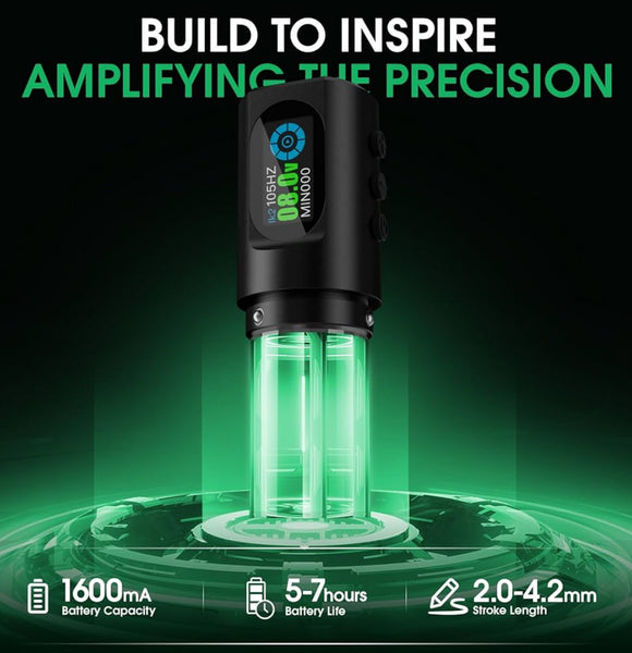 Steigern Sie Ihre Tätowierkunst mit der kabellosen Inkflexo-Tätowiermaschine, einem hochmodernen Gerät, das auf Präzision, Vielseitigkeit und Benutzerfreundlichkeit ausgelegt ist. Ausgestattet mit einem leistungsstarken 1600-mAh-Akku sorgt dieses Gerät dafür, dass Sie über längere Zeiträume ununterbrochen arbeiten können und bietet während Ihrer Sitzungen eine konstante Leistung.